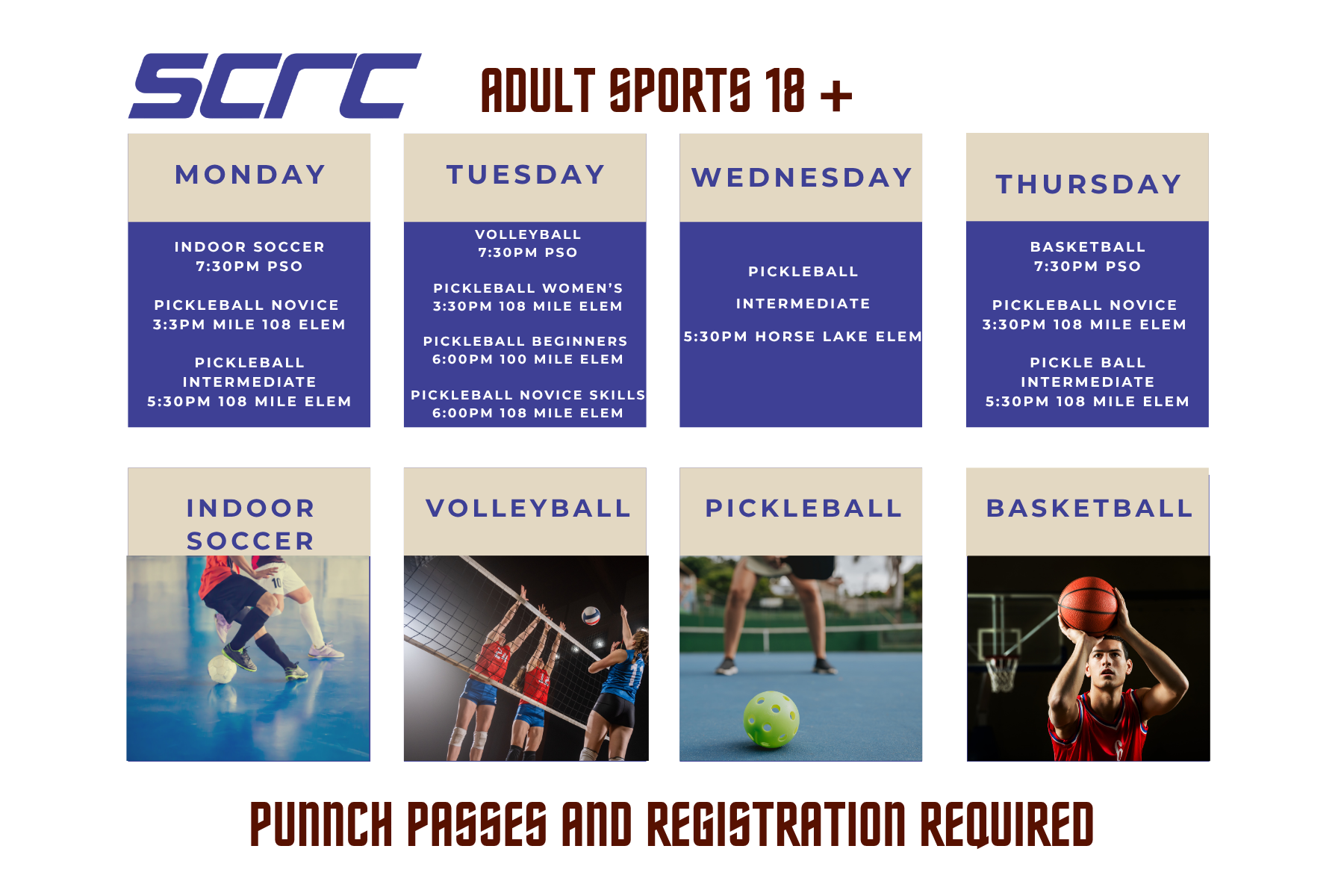 Adult recreation sports are a fun way to keep active throughout the winter in a fun non-competitive environment. Sports run October through May at various Sd 27 Schools. Registration and purchase of punch passes are required from the SCRC office prior to play. Times may vary depending on school availability. For ages 18 plus. Required punch passes can be purchased at the South Cariboo Rec Centre. *Players may be asked to play at a specific level for a time. For 18 years and over.